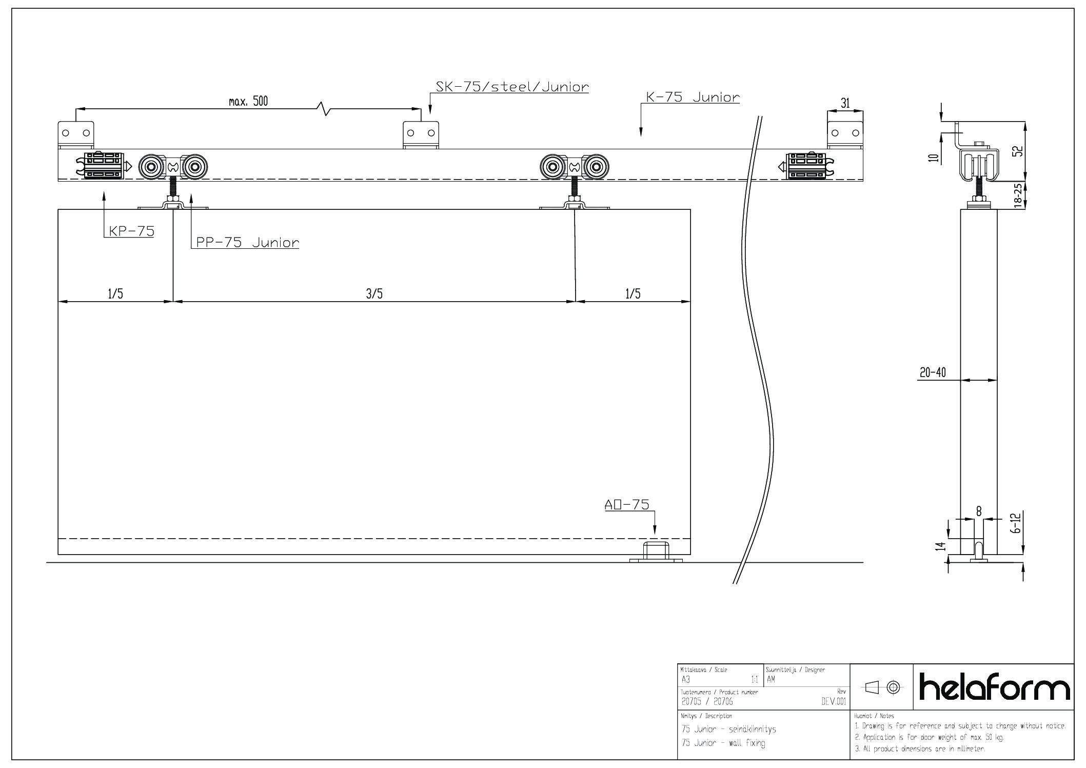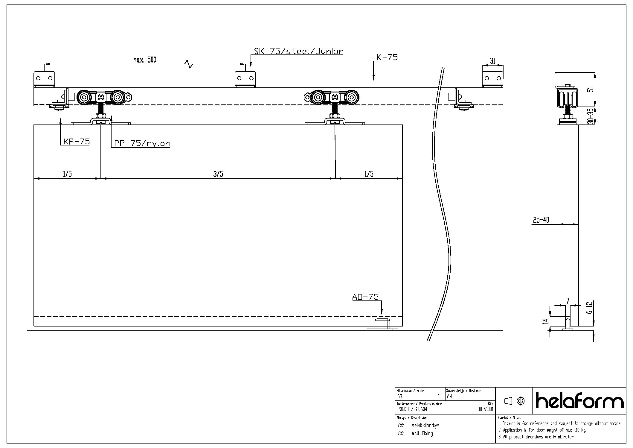 50 kgDo-It-Yourself fittings set package for 75 Junior series sliding door systems. Fittings set 75 Junior includes all the needed fittings including a track for one sliding door installation.