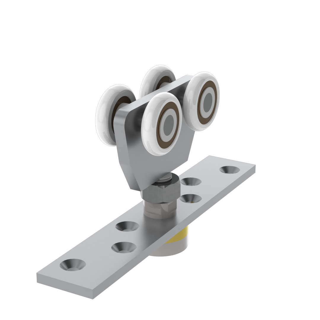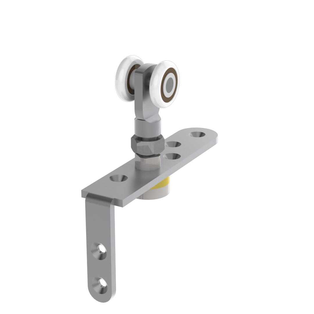 body: galvanized steel, wheel: nylon coated ball bearingSliding door hanger with guide wheels for 100 series conveyor systems.
